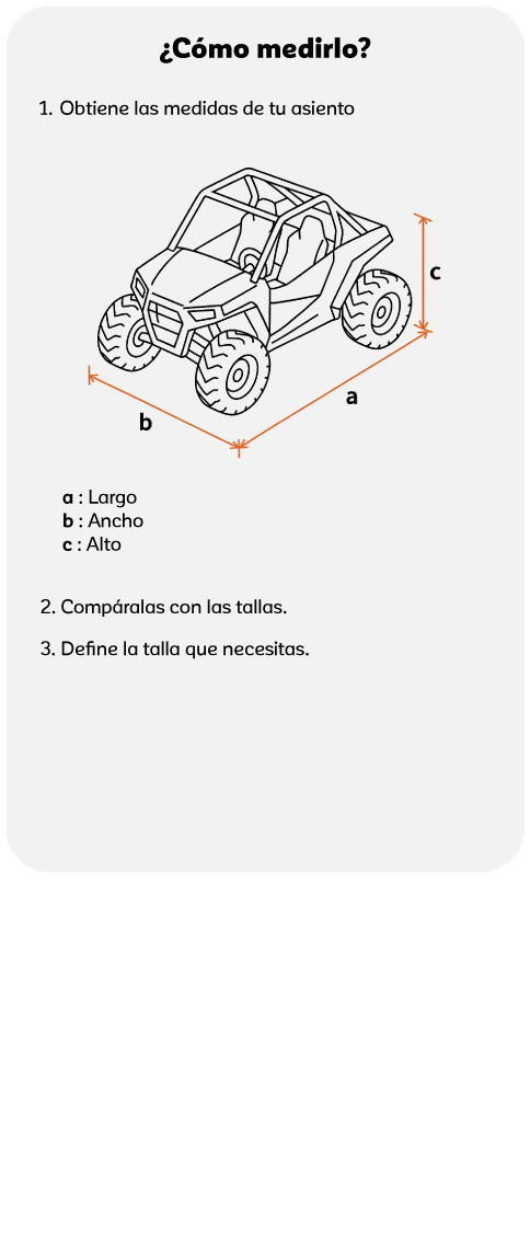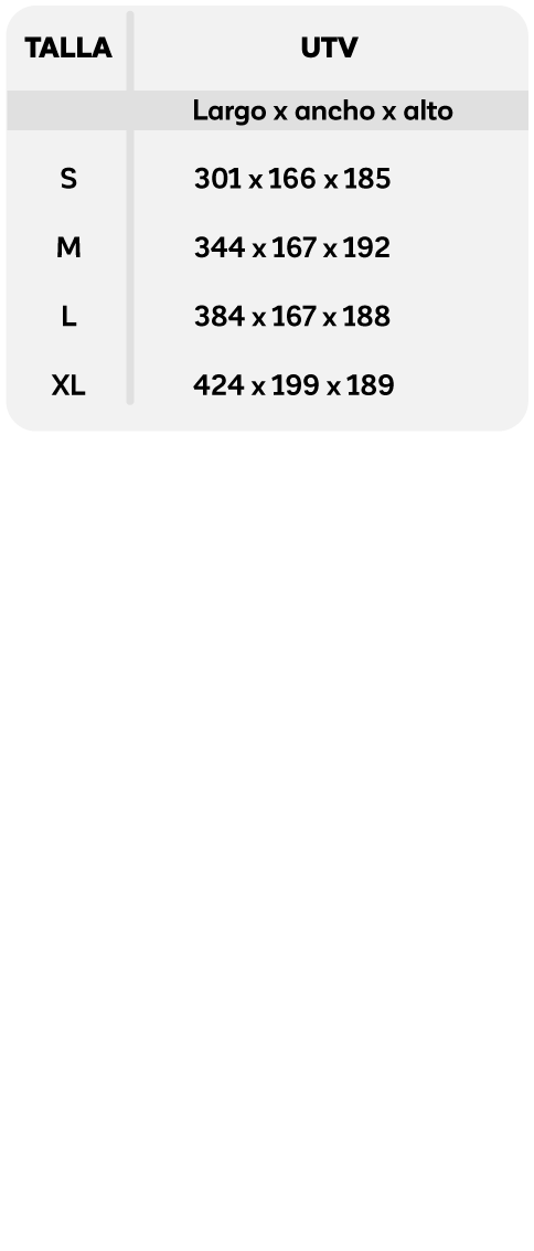 - Ajuste semi a medida con 4 tallas para todo tipo de UTV