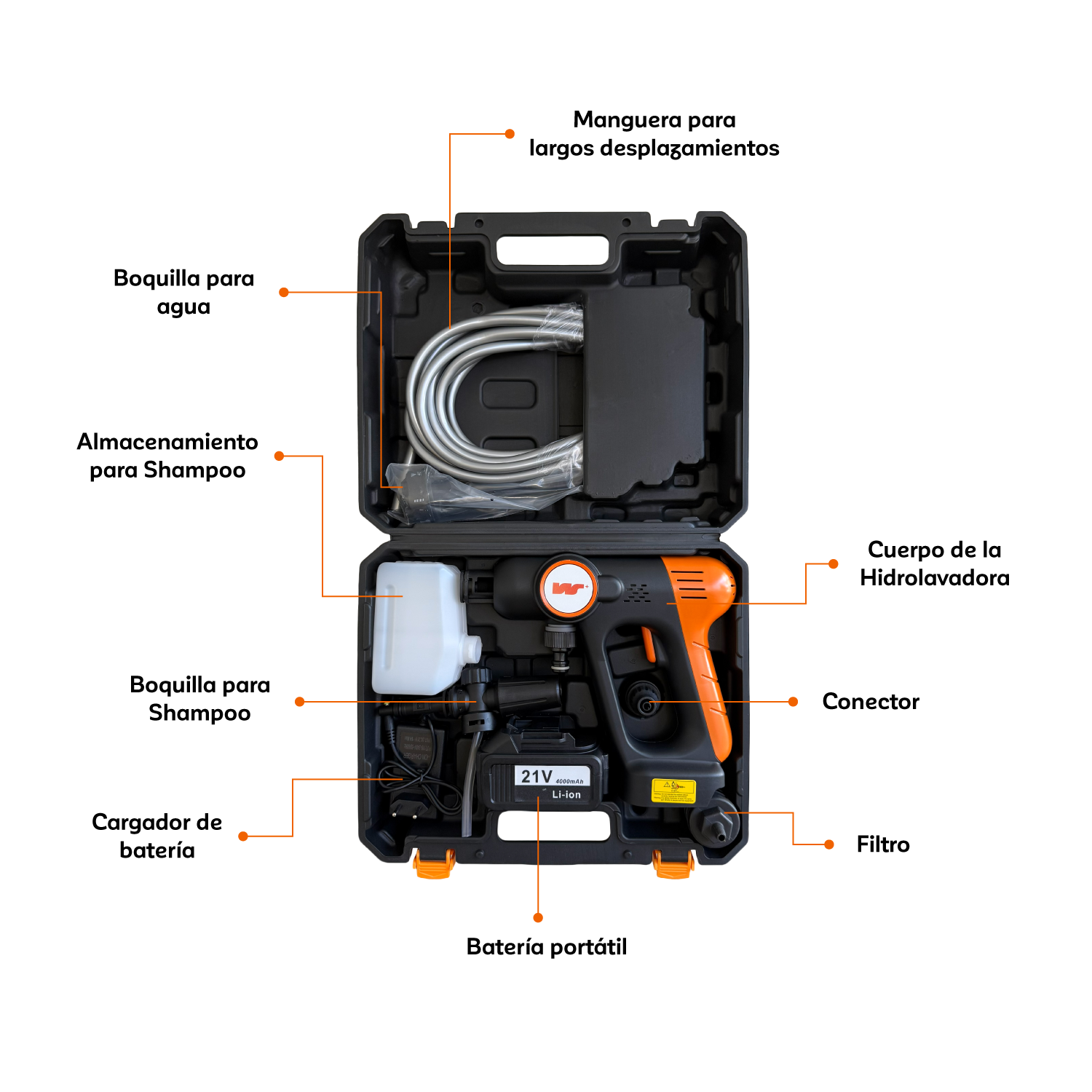 Es una hidrolavadora potente para su tamaño y peso. Es compacta y además tanto el motor como su batería, permiten una potencia considerable para limpiar por ejemplo, un vehículo tranquilamente.